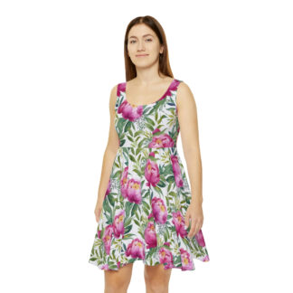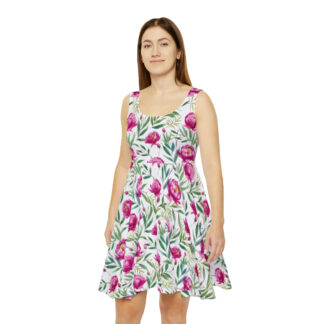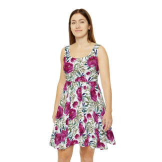 Boho High Waist Magenta Peony Watercolor Floral Summer Skater Dress Cute