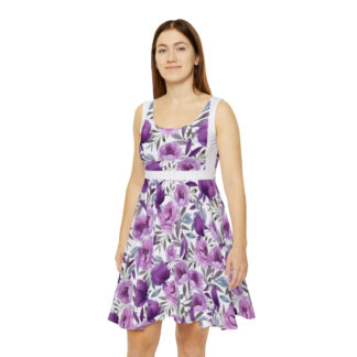 Boho High Waist Purple Peony Watercolor Floral Summer Skater Dress Cute