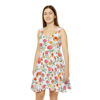 Boho High Waist Ranunculus Orange Pink Floral Watercolor Summer Skater Dress Cute