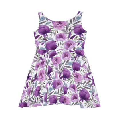This dress features a high waist and a mid-length cut, creating a flattering silhouette for any body type. The seam thread color is automatically matched to the design, ensuring that every detail of the gorgeous purple peony watercolor floral pattern stands out. Additionally, this dress has an asymmetrical skirt, making it unique and eye-catching.
